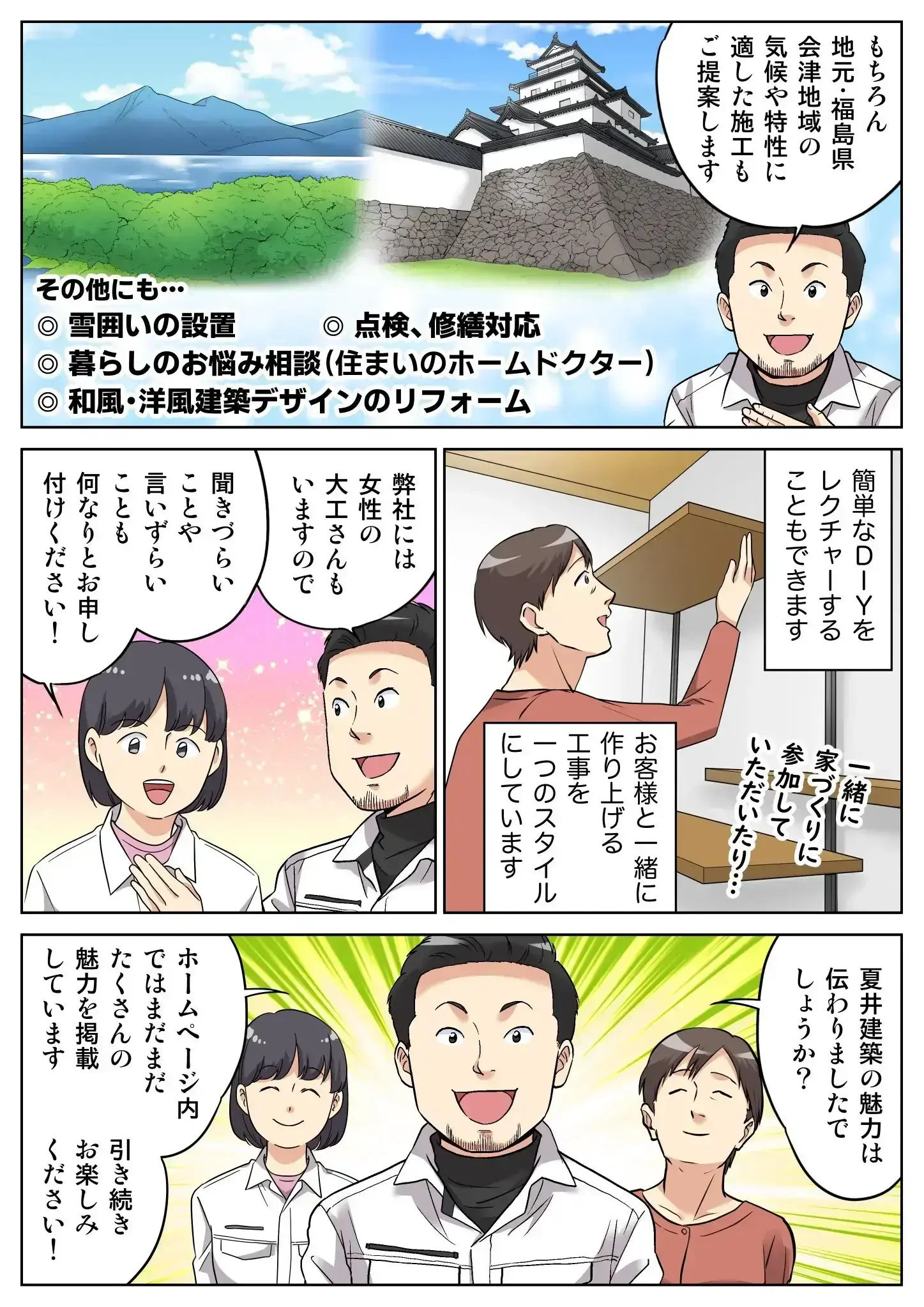 夏井建築は福島県会津地域に密着したサービスを提供しています。地域に愛される工事を心掛け、お客様のご要望に迅速かつ適切に対応。何かトラブルや相談があれば、迅速にお伺いします。